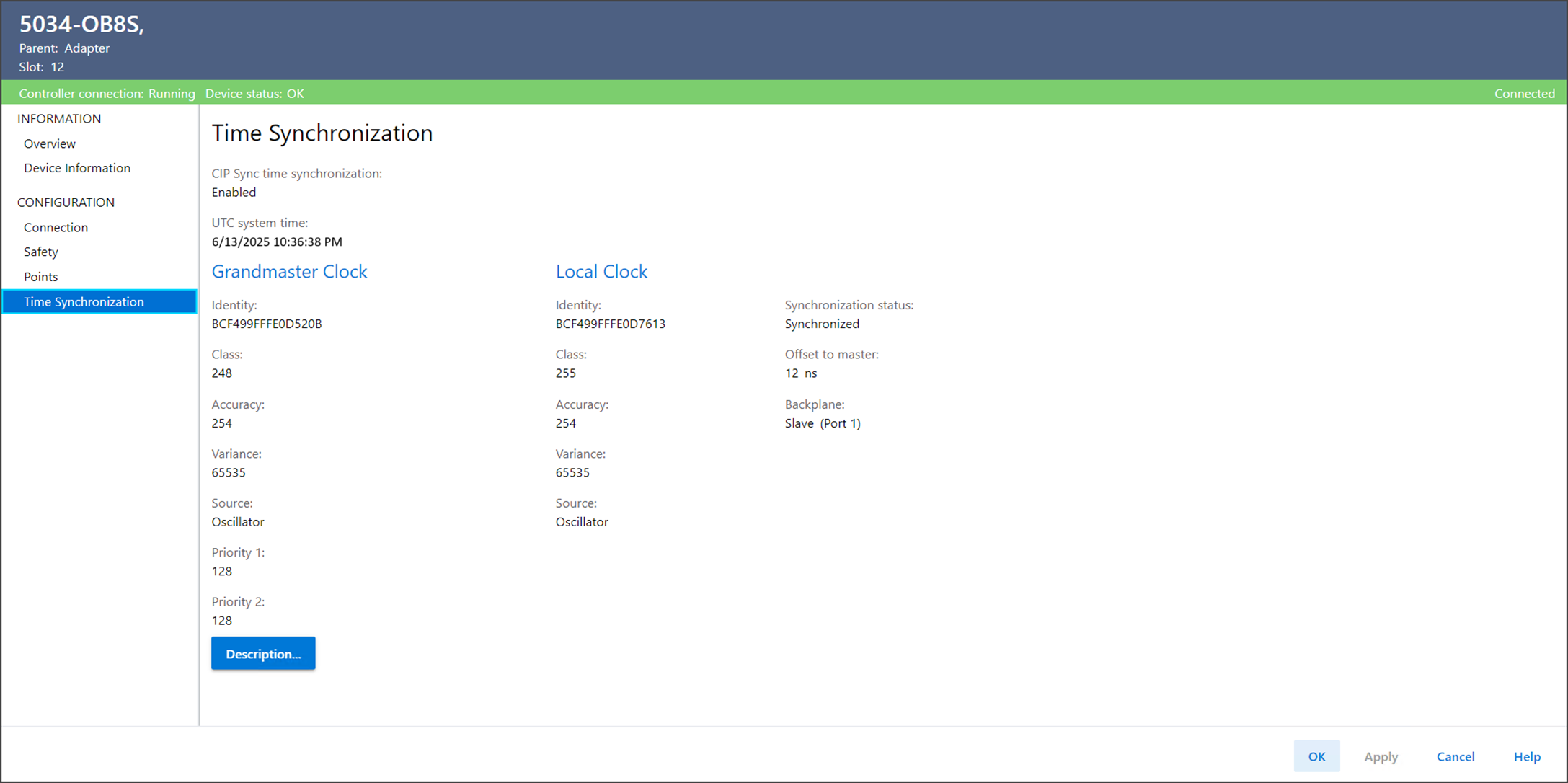Time Synchronizationビューは読取り専用です。プロジェクトがオンラインになっている場合のモジュールに関するCIP Syncステータス情報が表示されます。 Time Synchronizationには、以下の情報が表示されます。