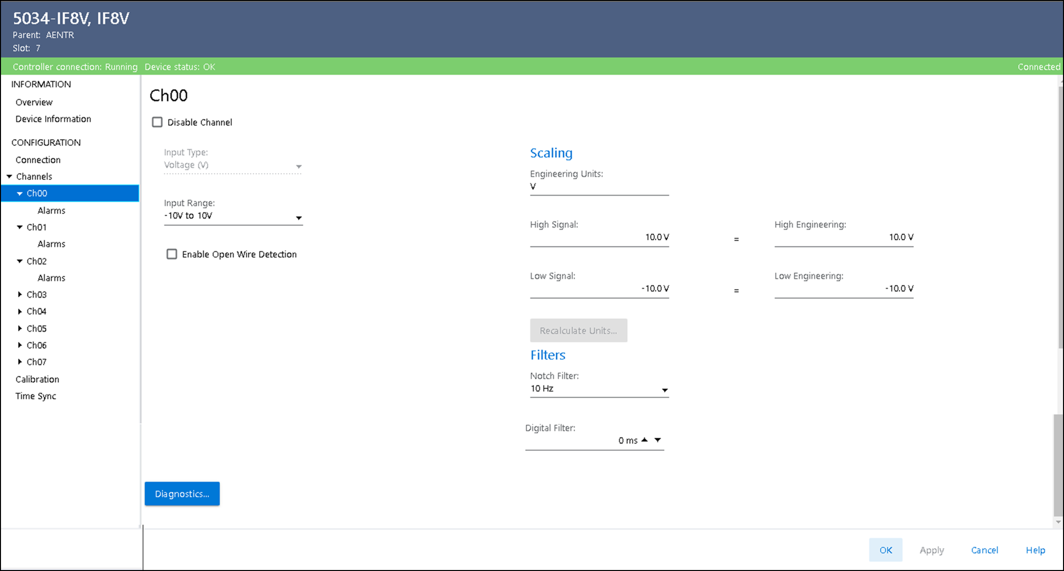 モジュールと接続されている場合にチャネル診断情報を表示します。 モジュールとオンラインになっている場合にChxxビューのDiagnosticsを選択すると、診断情報が表示されます。