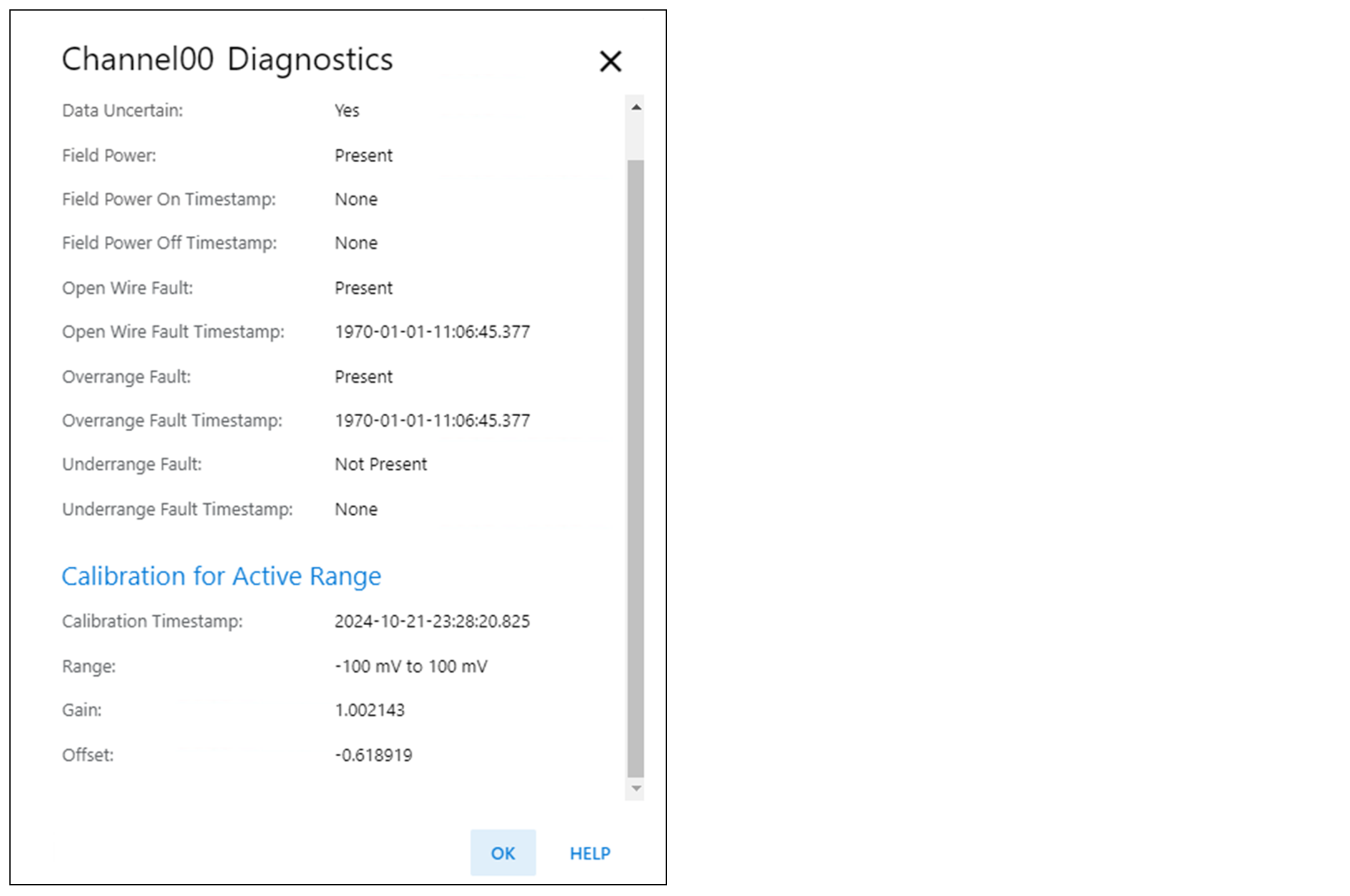 モジュールと接続されている場合にチャネル診断情報を表示します。 モジュールとオンラインになっている場合にChxxビューのDiagnosticsを選択すると、診断情報が表示されます。