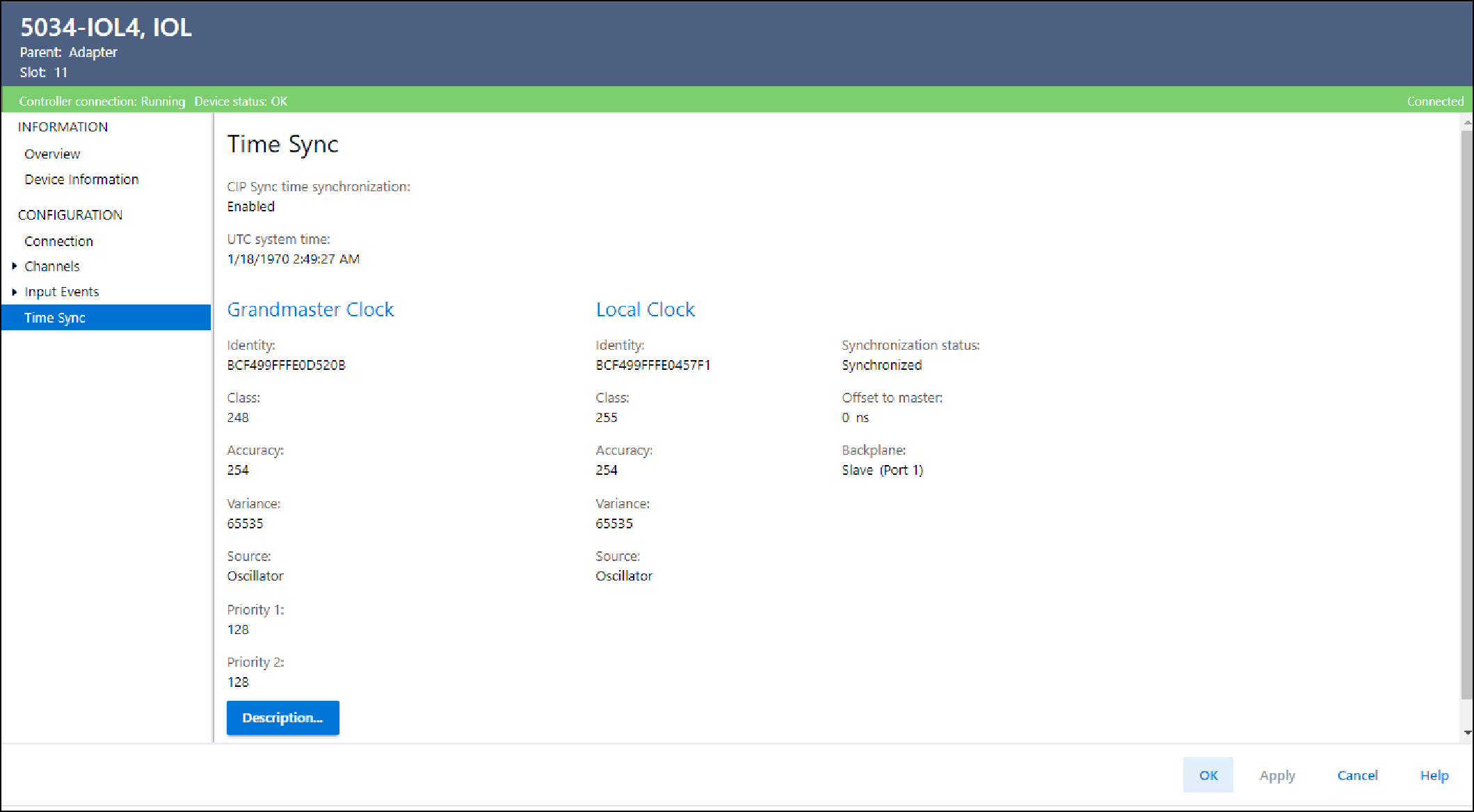 Grandmaster clock descriptionダイアログには、グランドマスタークロックに関する詳細情報が表示されます。Grandmaster clock descriptionを表示するには、Time SyncビューでDescriptionを選択します。