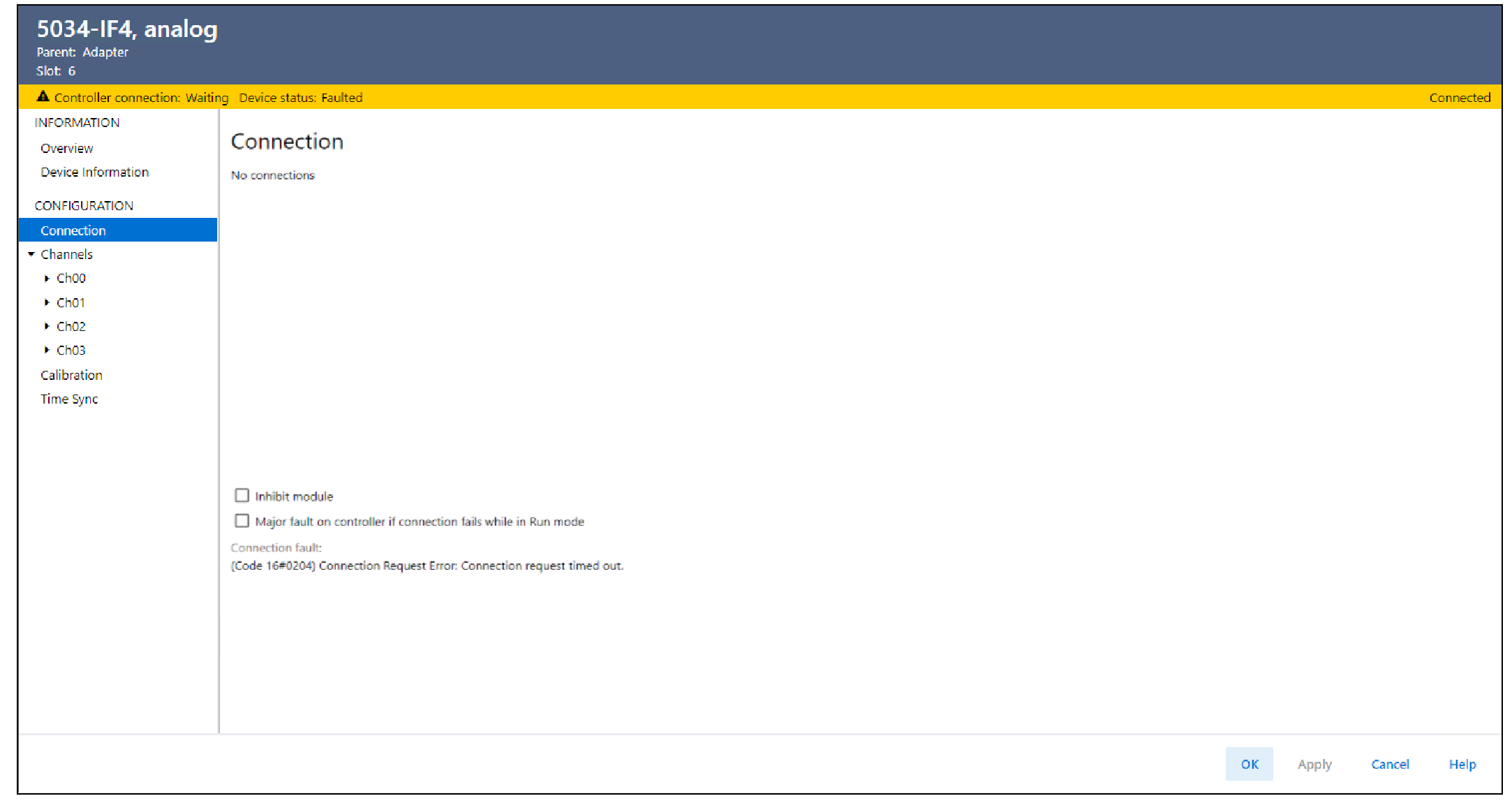 コネクションにフォルトが発生した場合は、Connectionビューに移動し、Connection Fault領域のエラーコードを確認します。