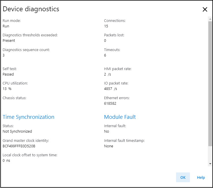 時間同期フォルトが発生した場合は、Device Diagnosticsダイアログに移動し、Time SynchronizationのStatusとGrandmaster clock identityを確認します。