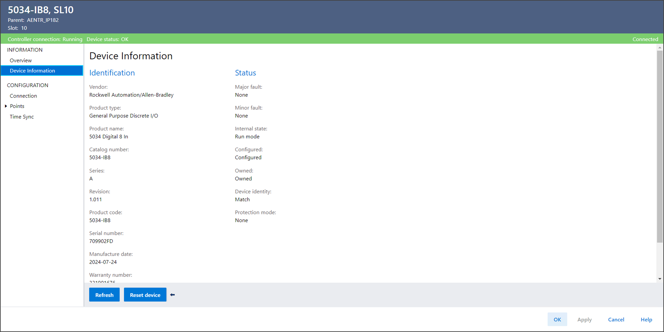 Device Information을 사용하여 장치가 온라인 상태일 때 장치 및 상태 정보를 볼 수 있습니다.
