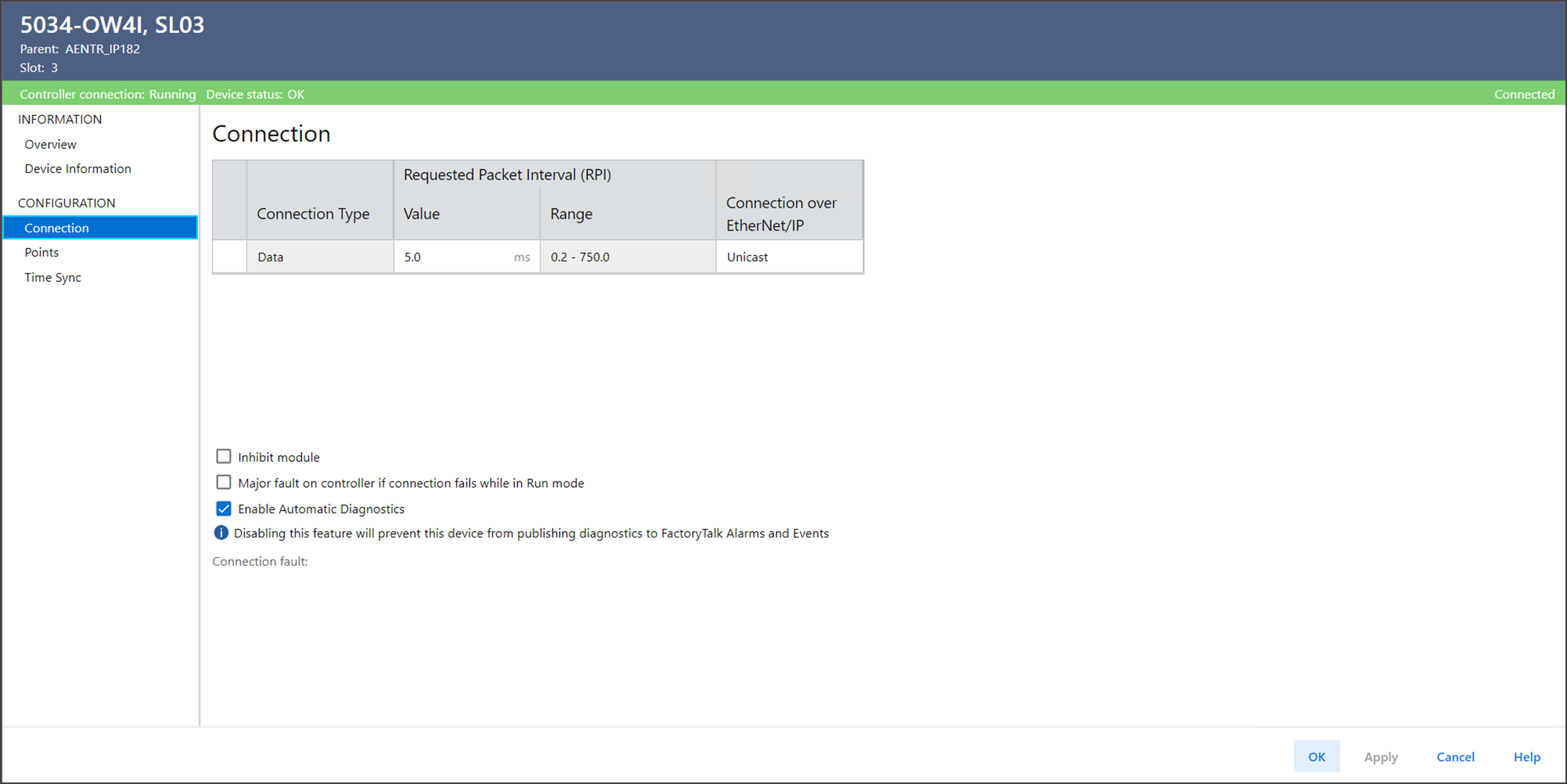 - Connection Fault의 원인을 확인하십시오.팁:연결 폴트가 있는 경우, 모듈의 문제를 해결하는 데 도움이 되도록 Connection Fault 영역에 설명과 함께 에러 코드가 표시됩니다. 자세한 정보는 모듈 문제 해결을 참조하십시오.
