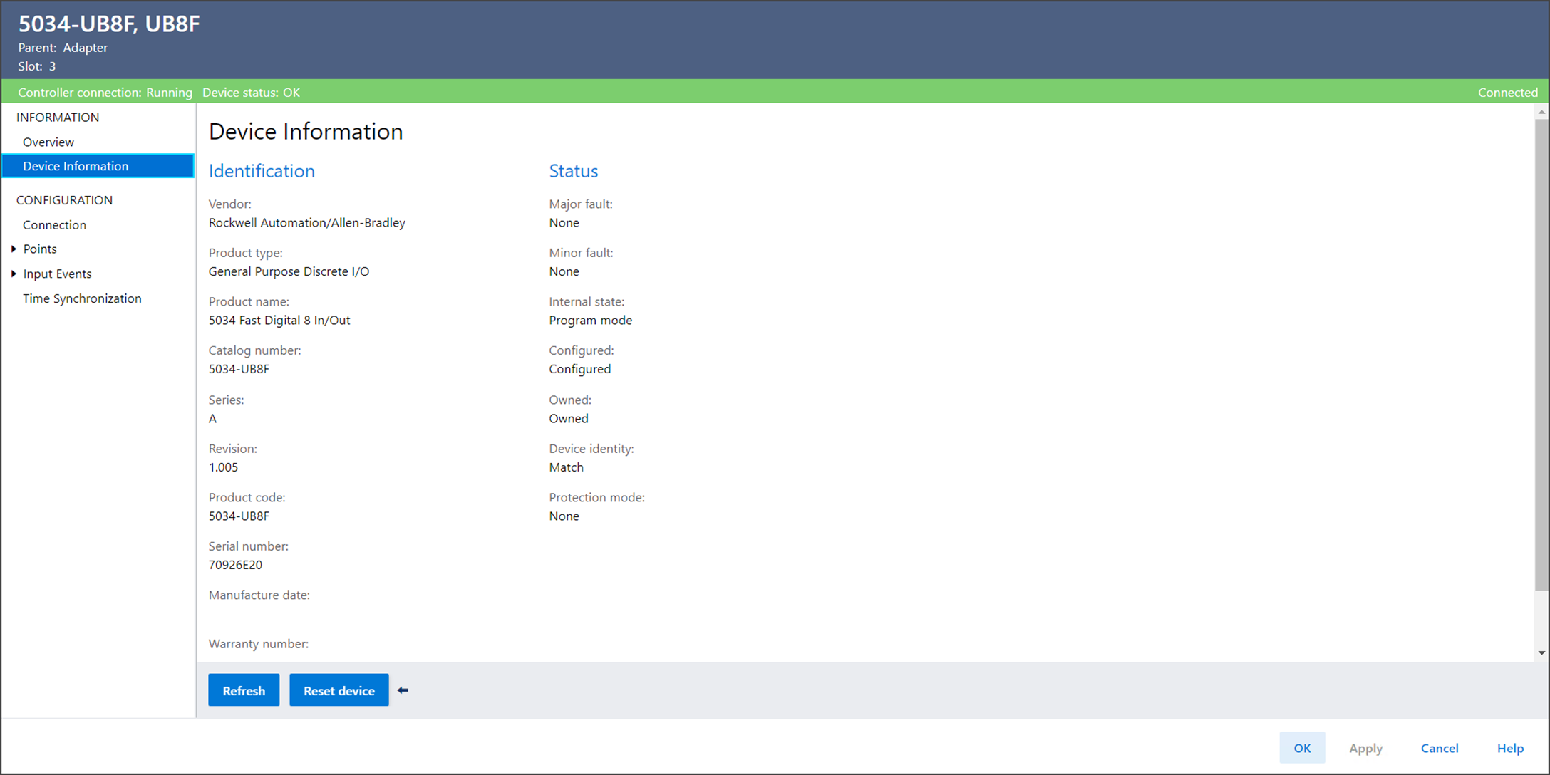 Device Information을 사용하여 장치가 온라인 상태일 때 장치 및 상태 정보를 볼 수 있습니다.