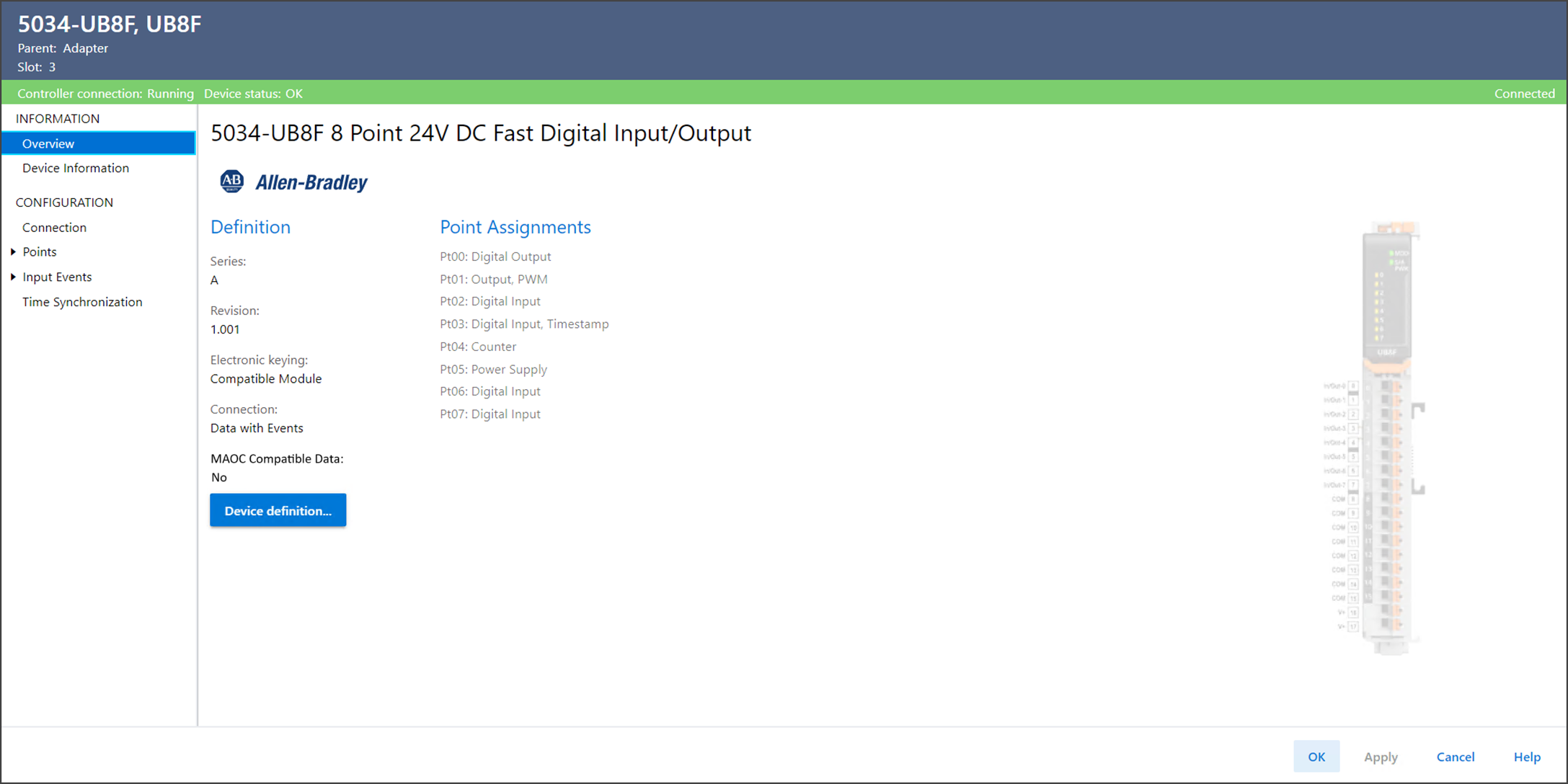 Device Definition | Device Definition 대화상자를 열어 버전, Electronic Keying, 포인트 모드 및 기타 장치별 값을 변경합니다. |