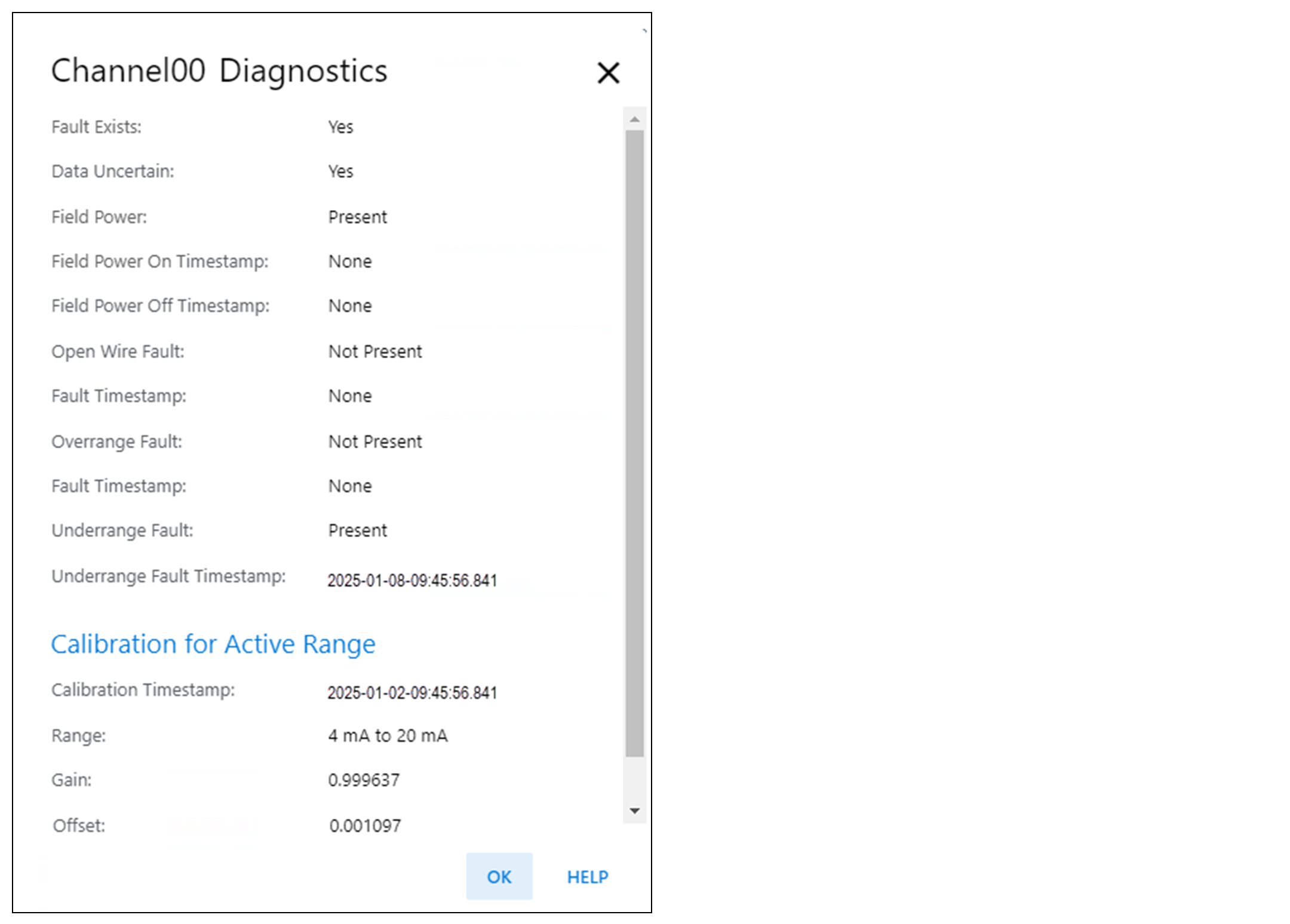 모듈과 연결되었을 때 채널 진단 정보를 표시합니다. 모듈과 온라인 상태인 경우, Chxx 보기의 Diagnostics 를 선택하여 진단 정보를 확인합니다.