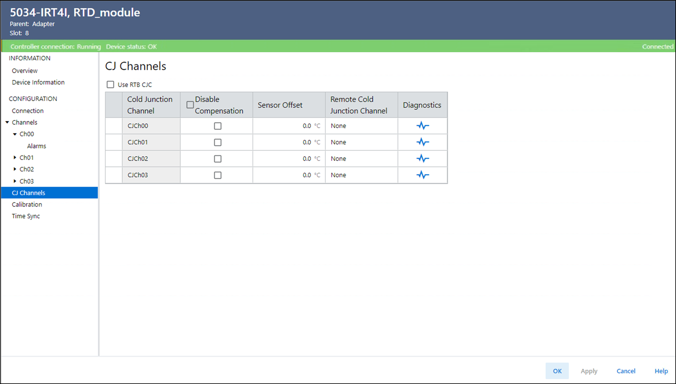 - RTB CJC - Remote Cold Junction Channel 열에서 None을 선택하고 CJC가 있는 RTB를 사용하는 경우, 채널이 CJ 보상을 위해 RTB CJC를 사용하고 있다고 가정할 수 있습니다.중요: 정확도 요건 때문에 RTB CJC를 사용해야 하는 경우, Use RTB CJC 확인란이 선택되어 있고 RTB with CJC를 사용하고 있는지 확인하십시오. Use RTB CJC 확인란이 선택된 상태에서 표준 RTB(CJC 없음)를 사용하는 경우, 채널에 폴트가 발생합니다.