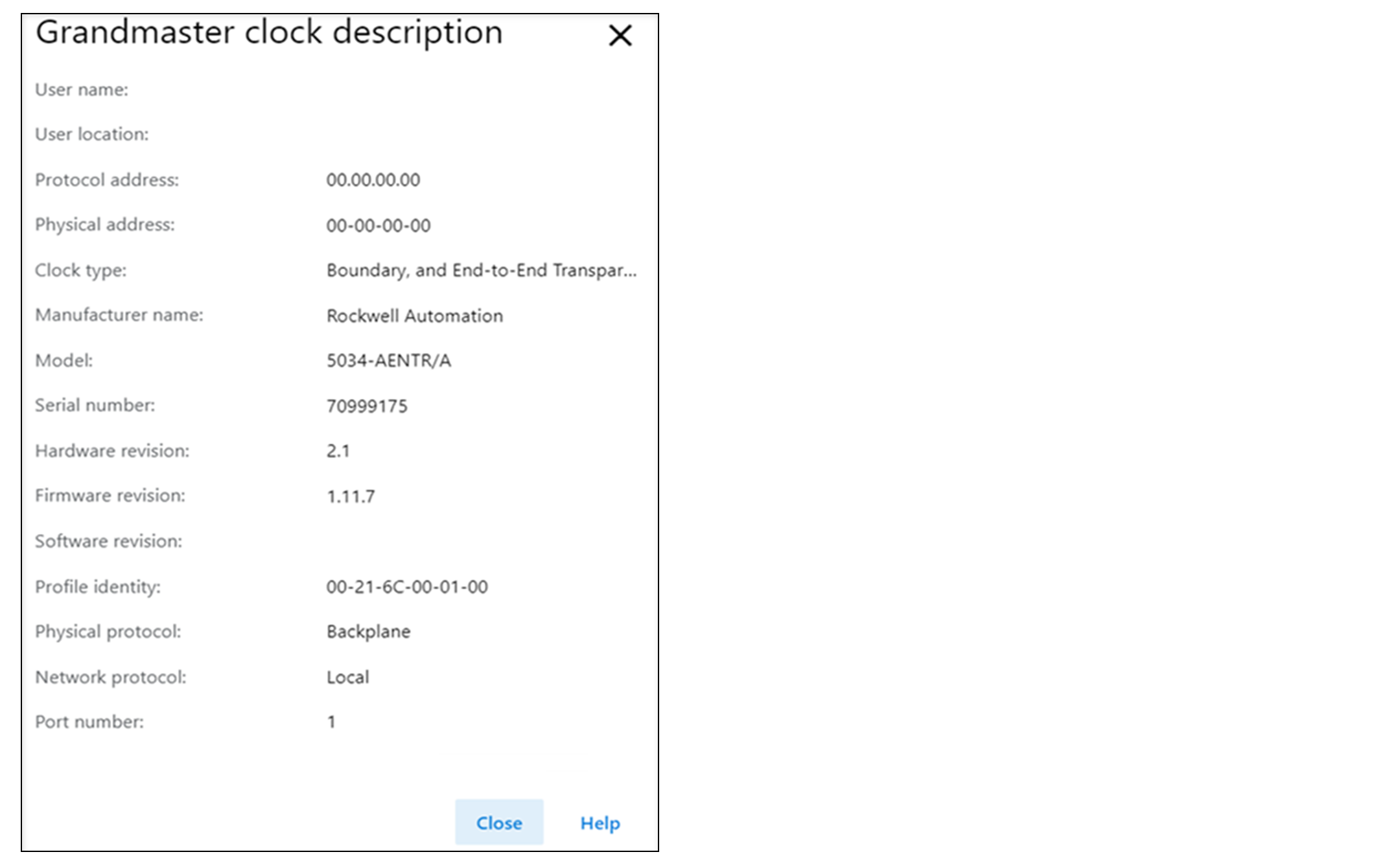 Grandmaster 클럭 설명 대화상자는 Grandmaster 클럭에 대한 자세한 정보를 제공합니다. Grandmaster 클럭 설명을 보려면 Time Sync 보기에서 Description을 선택하십시오.