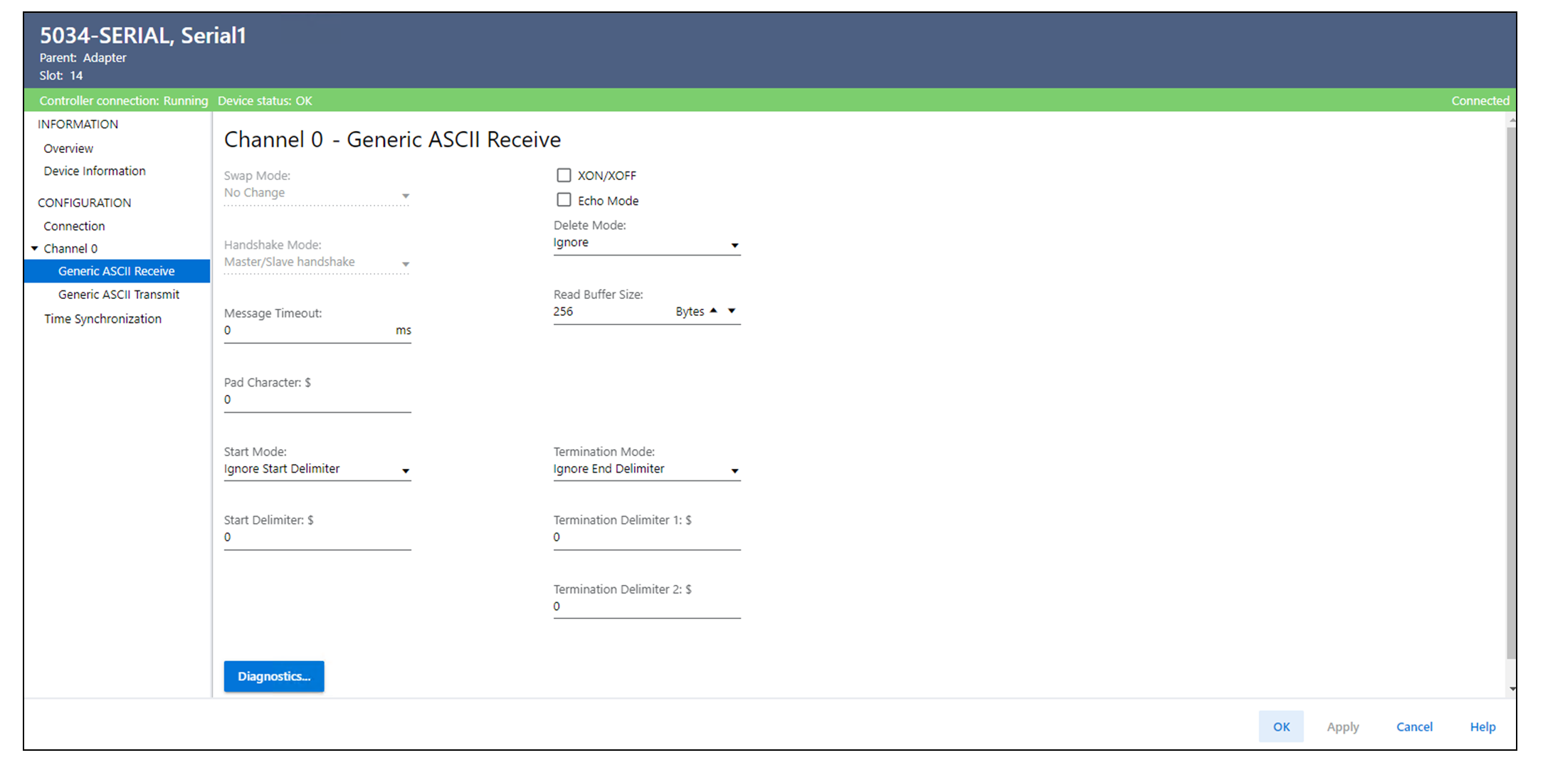 Diagnostics | 컨트롤러 상태가 온라인이면 Diagnostics 대화상자를 열어 Generic ASCII 통신을 사용한 성능 및 에러 관리를 위한 진단 카운터를 확인하십시오. | – |
