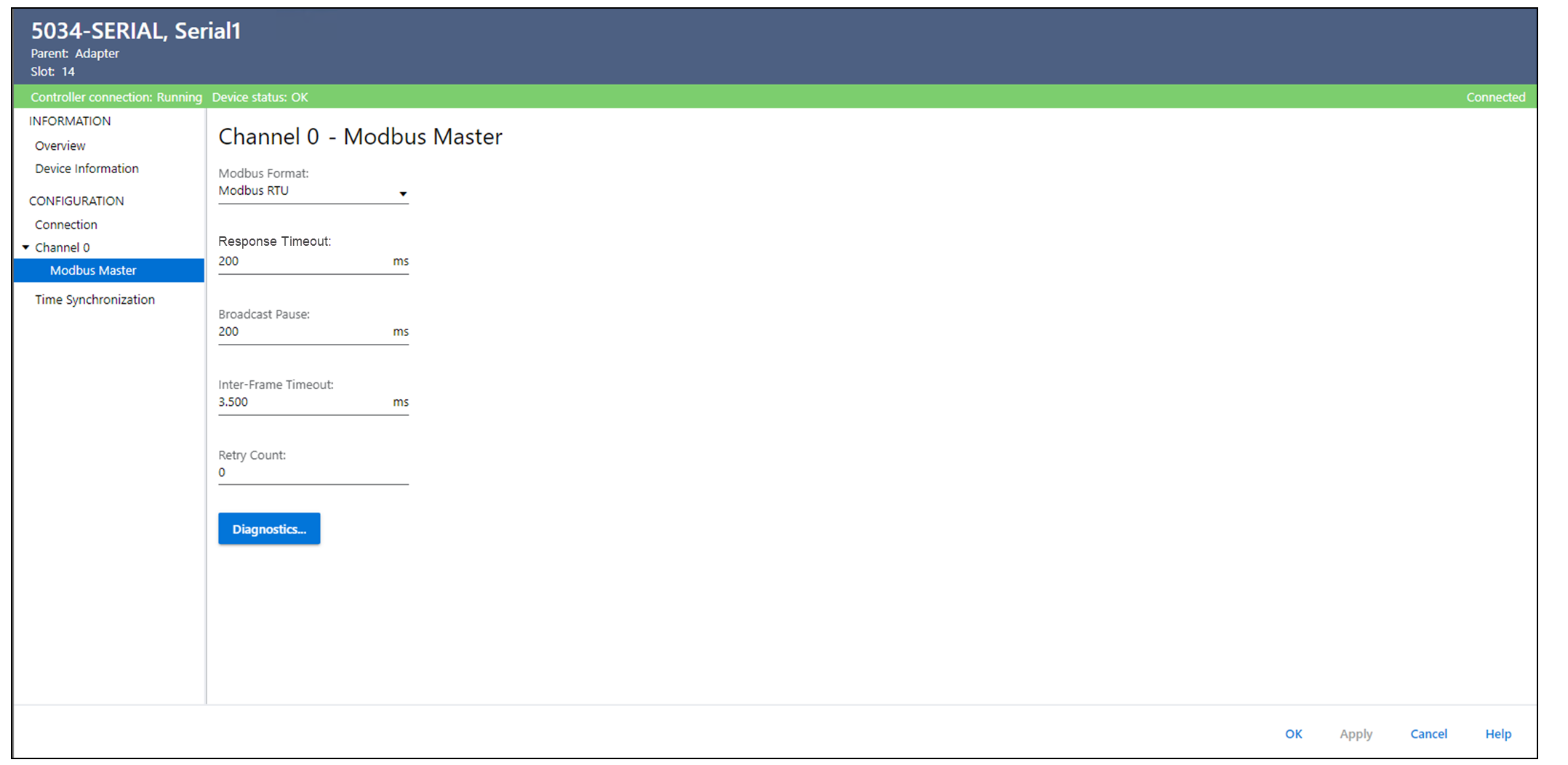 Diagnostics를 선택하면 Modbus Master 채널의 진단 정보를 볼 수 있습니다.