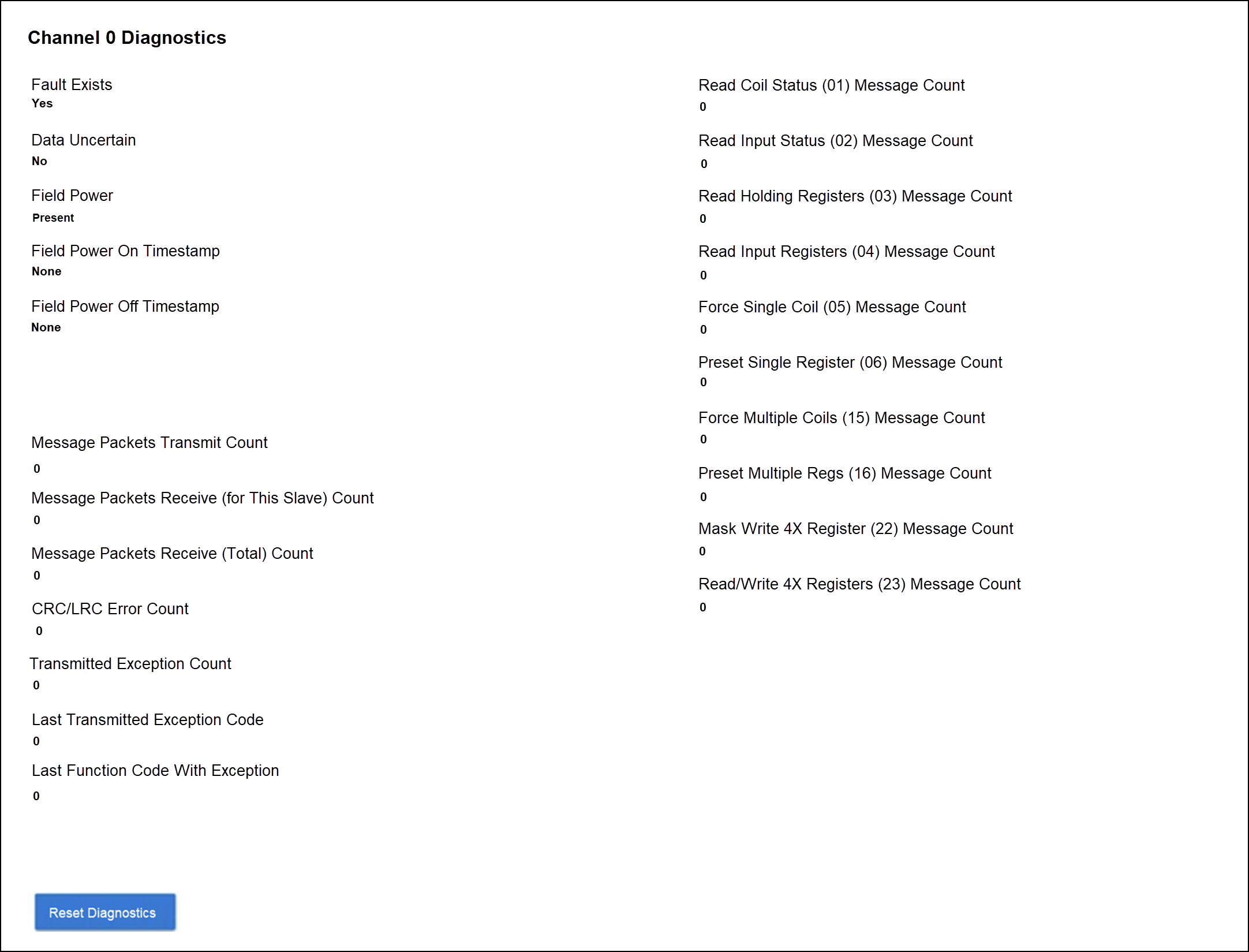 Diagnostics를 선택하면 Modbus Slave 채널의 진단 정보를 볼 수 있습니다.
