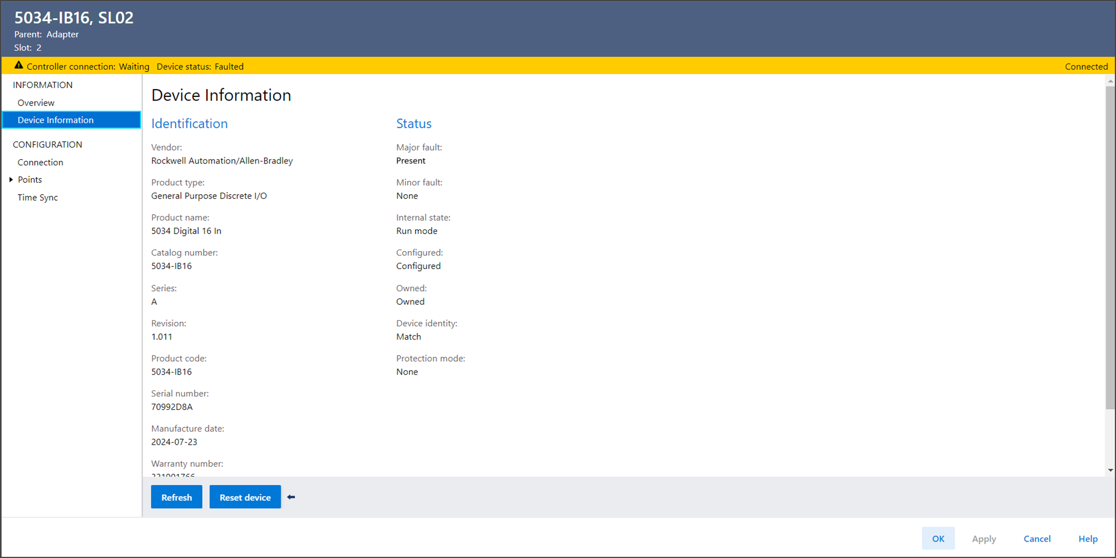 경고 아이콘이 있는 경우, Module Properties를 열고 상태 표시줄을 확인해 폴트 유형을 확인하십시오.