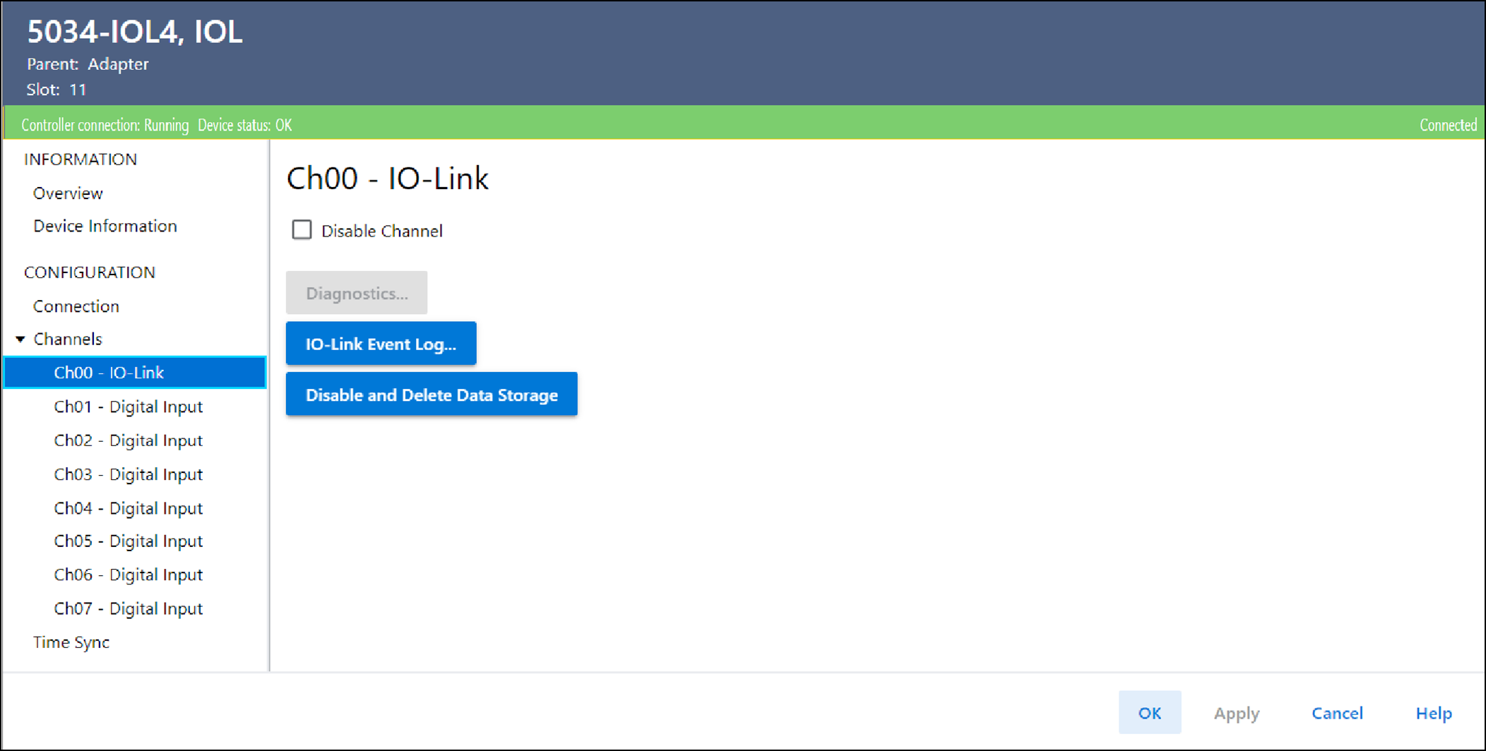 Esta visualização estará disponível quando o canal estiver configurado como “IO-Link”. Você pode realizar certas tarefas somente quando o projeto estiver on-line.