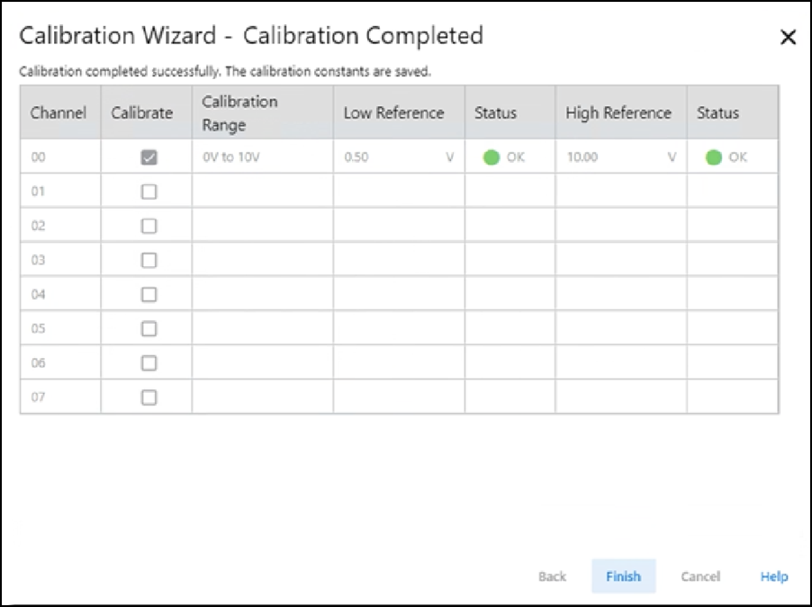 - Selecione Next. A caixa de diálogo Resultados de alta referência é exibida e indica o status do canal calibrado.