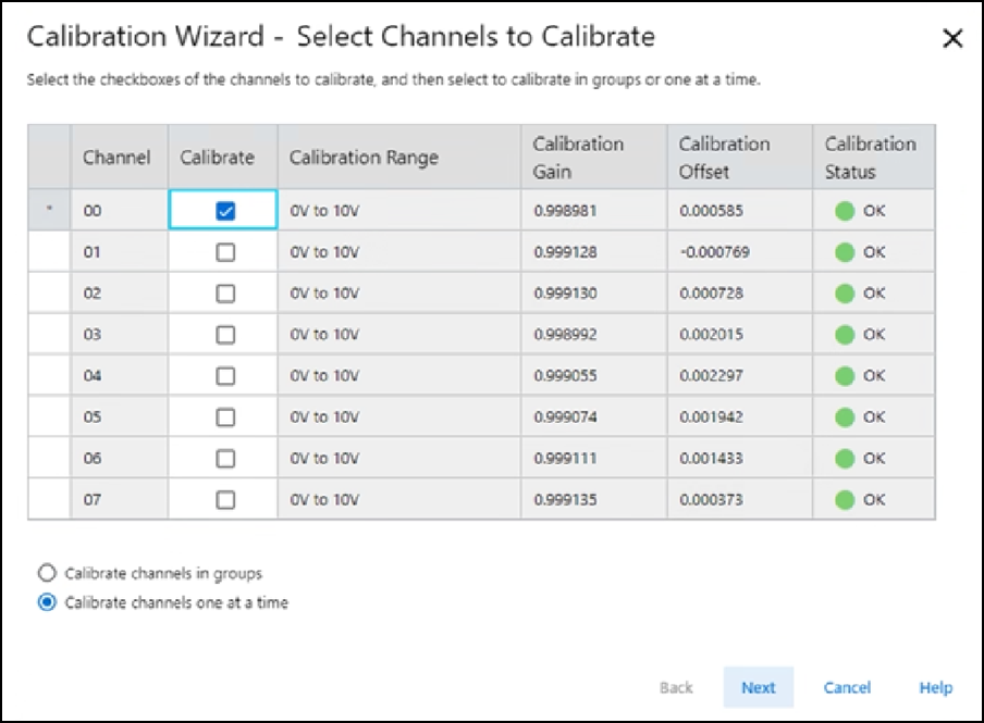 - Selecione os canais um de cada vez ou em grupos para calibrar e selecione Next.