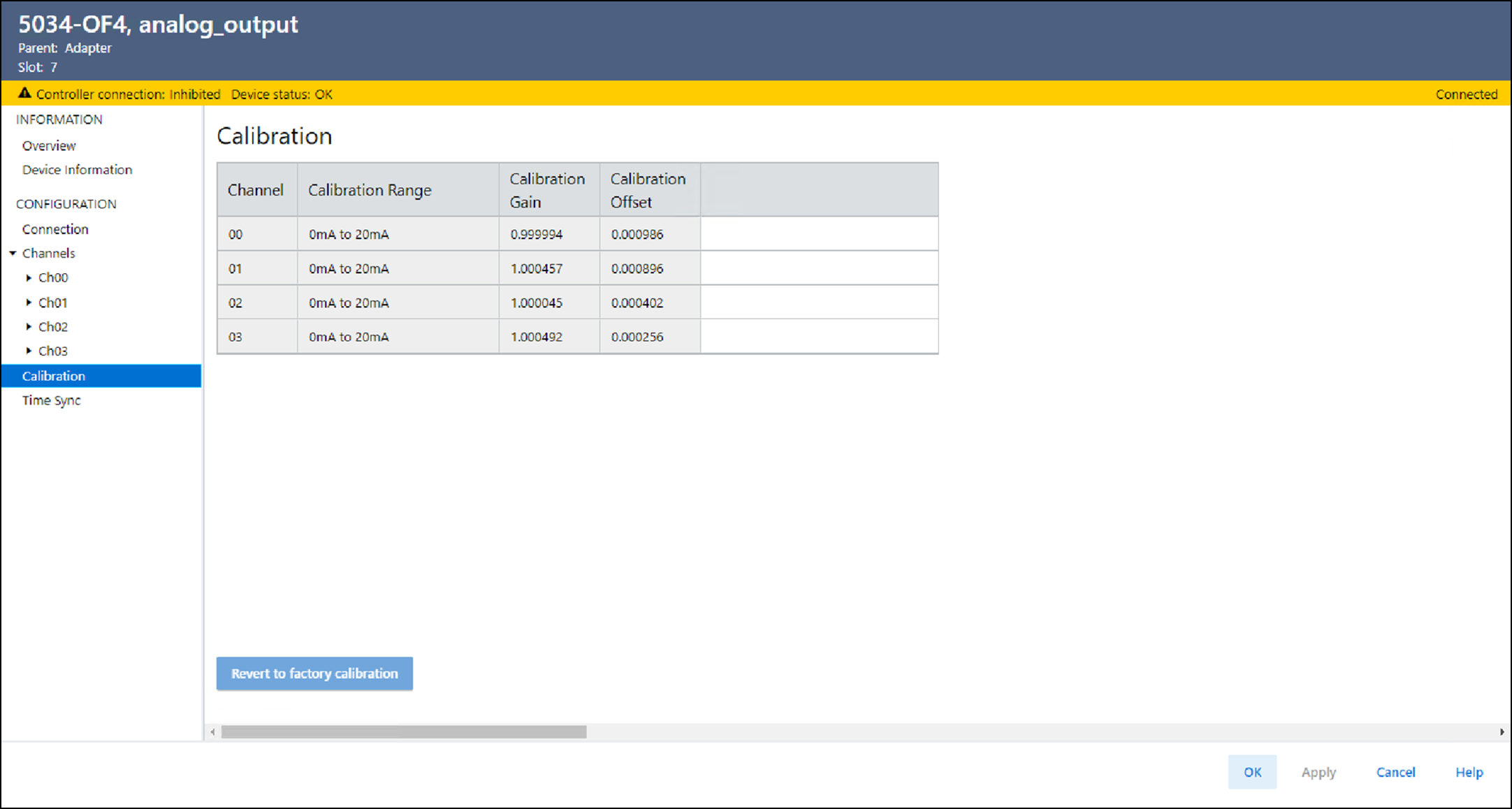 A visualização Calibração apresenta informações de calibração para todos os canais no módulo. Você pode realizar as seguintes ações nessa visualização para todos os canais: