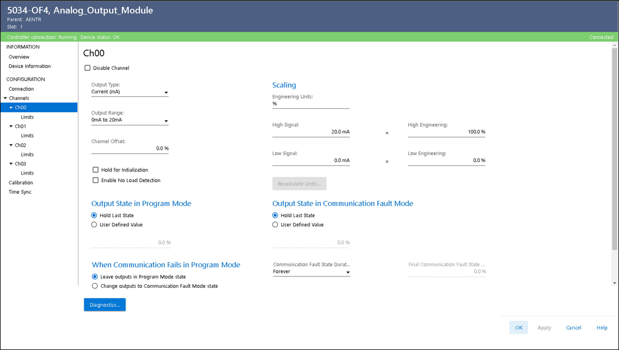 Exibe as informações de diagnóstico do canal quando conectado ao módulo. Quando estiver on-line com o módulo, selecione Diagnóstico na visualização Chxx para ver as informações de diagnóstico.