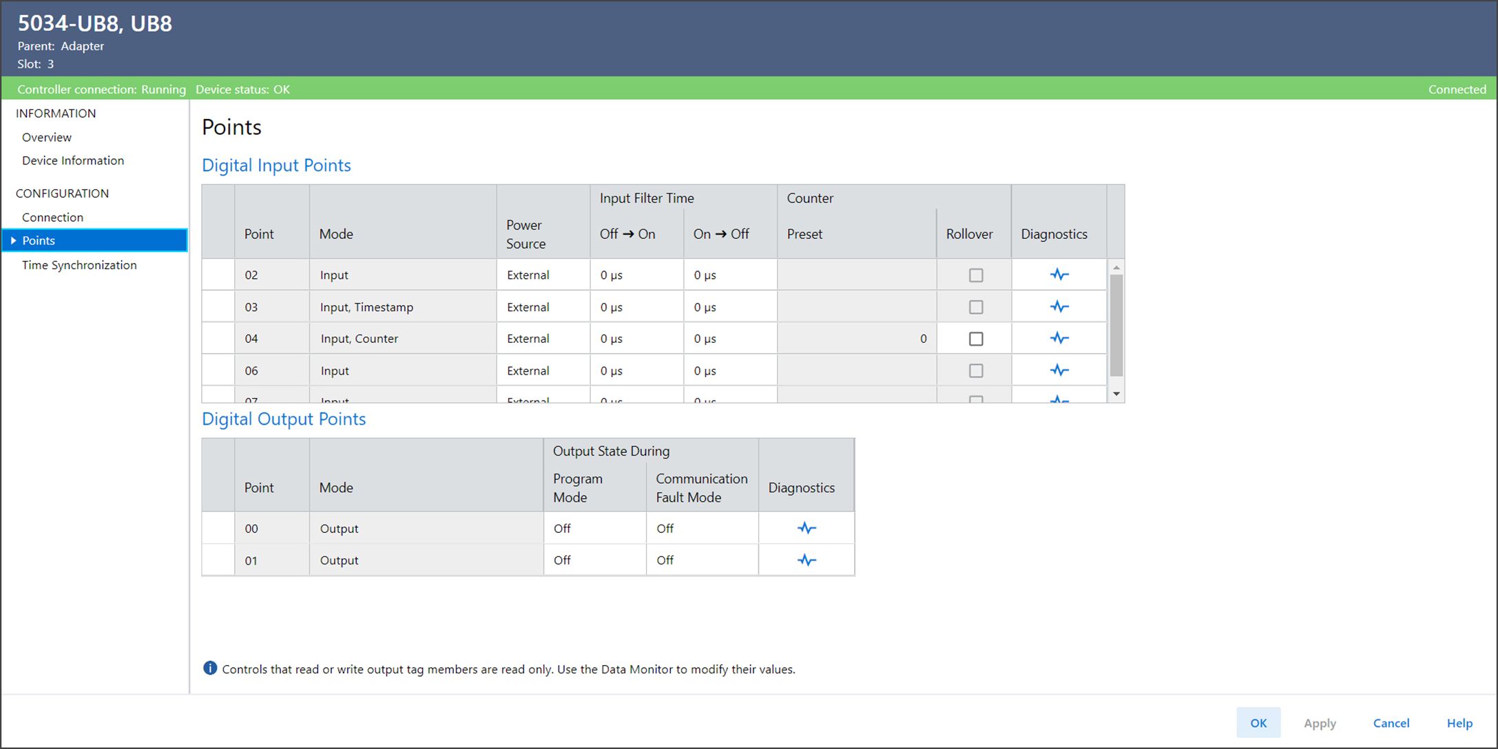 Para visualizar os diagnósticos Ptxx, selecione Diagnostics na visualização Pontos ou Ptxx.